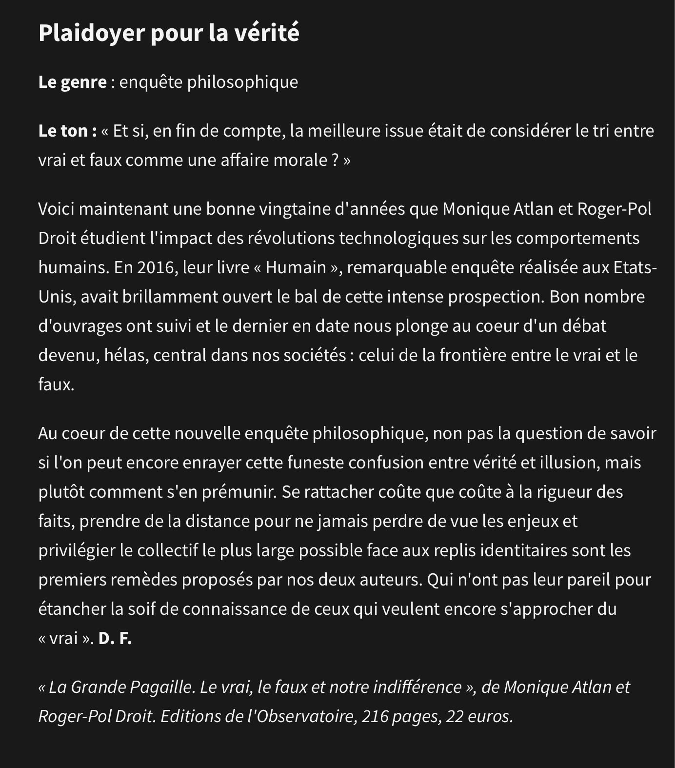 - « C’est peut-être le seul sujet du moment, la seule question que l’on ait vraiment envie de se poser. Comment continuer d’avancer dans un monde où le vrai s’évapore ? » Laurent Lemire, Livres Hebdo