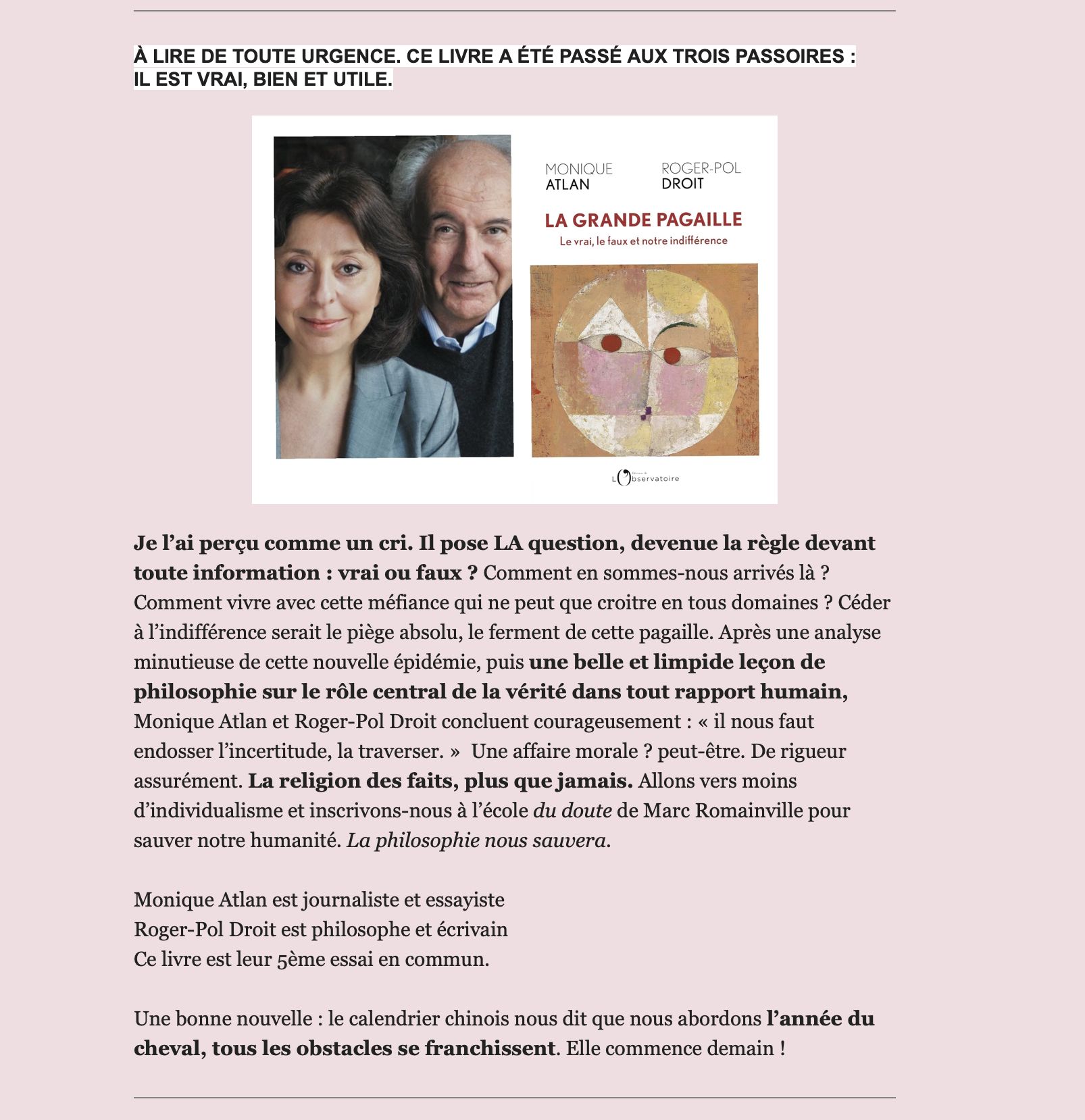 - « Une belle réflexion » Patrice Bollon, Lire Magazine